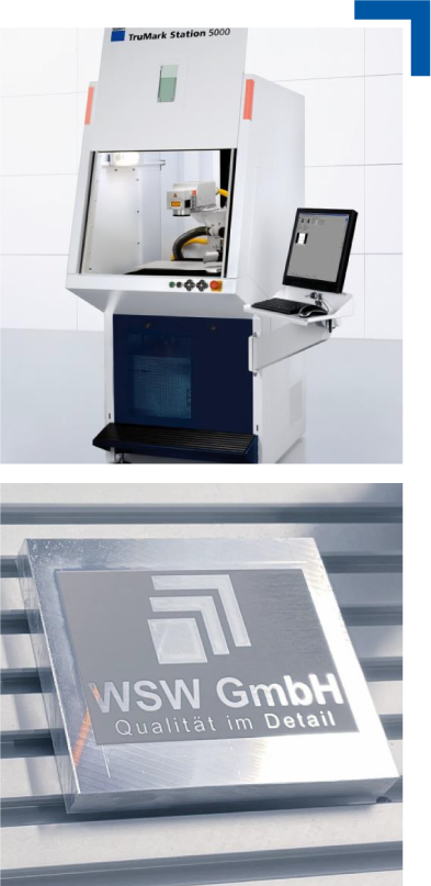 Mit dem 100 Watt Faserlaser Trumpf TruMark Station 5000 ist erneut ein besonders leis­tungsstarkes Gerät im WSW Maschinenpark eingezogen. Es eröffnet uns nicht nur eine große Bandbreite an individuellen Beschriftungs­möglichkeiten. Sondern es sorgt auch dafür, dass wir Fertigungsteile in kürzester Zeit nach den Wünschen unserer Kunden bearbeiten können.